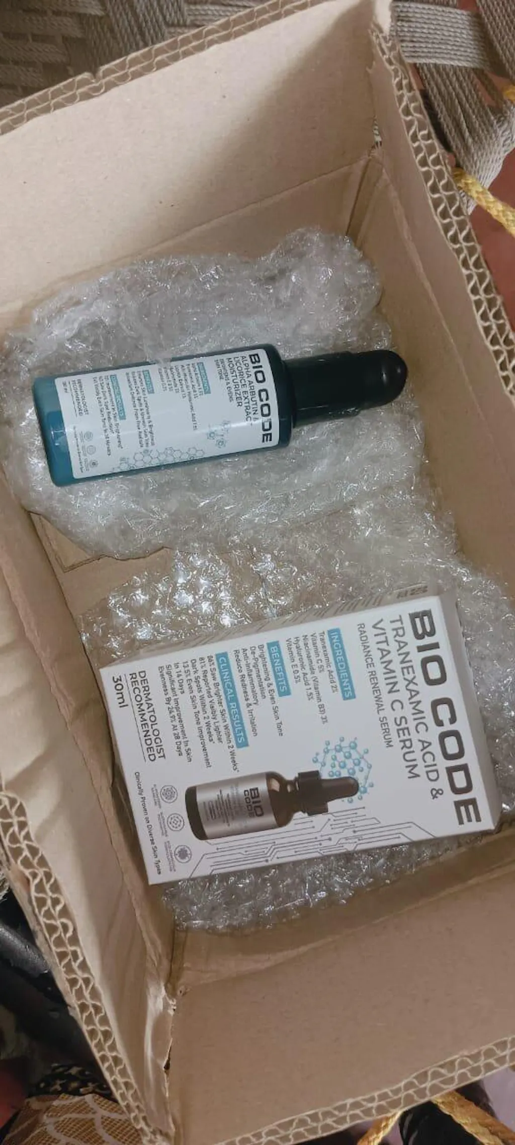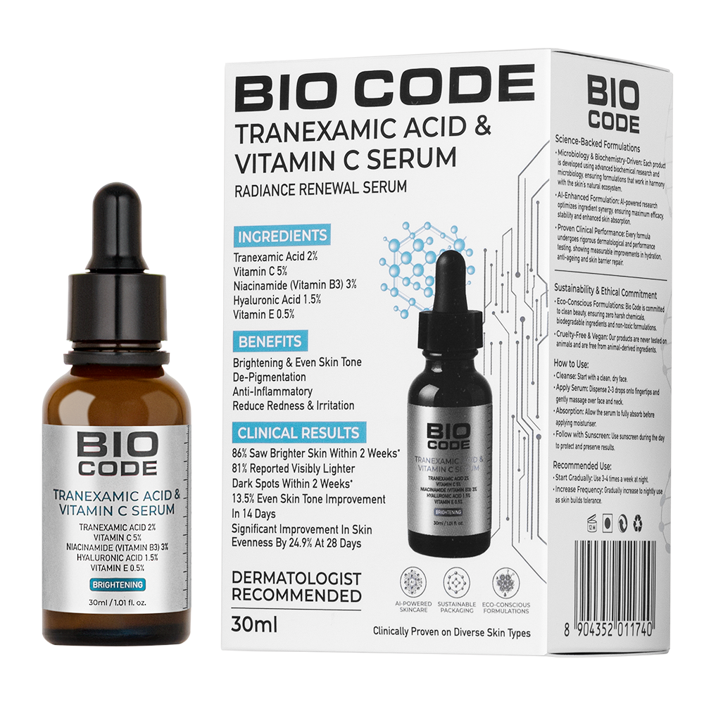 Bio Code's Radiance Renewal Serum is formulated to address uneven skin tone and hyperpigmentation with the power of biotechnology and AI innovation. This potent brightening serum combines Tranexamic Acid and Vitamin C to diminish dark spots and enhance skin luminosity. Our AI-Enhanced Formula optimizes ingredient synergy, ensuring maximum absorption and efficacy while maintaining skin hydration and stability. Reveal luminous skin with Bio Code's Radiance Renewal Serum. Our advanced formula utilizes AI-Optimized Ingredient Synergy, combining Tranexamic Acid and Vitamin C to reduce dark spots, hyperpigmentation, and uneven skin tone. Clinically proven to even out skin tone and enhance radiance, this serum delivers a brighter, more luminous and even complexion.
